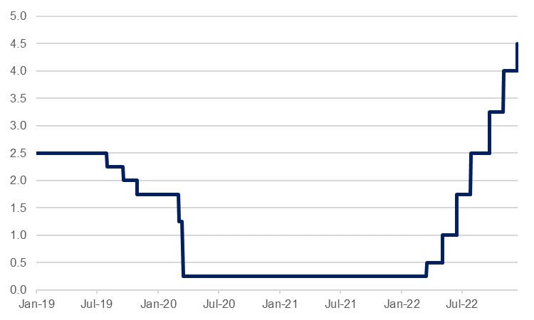 The FOMC raised the fed funds target range by 50bps at its meeting yesterday, taking the upper bound to 4.50%. This was in line with our long-held expectations, and the consensus outlook was also for a slowdown from the straight run of four 75bps hikes at the meetings prior to this one. The decision was a unanimous one.
