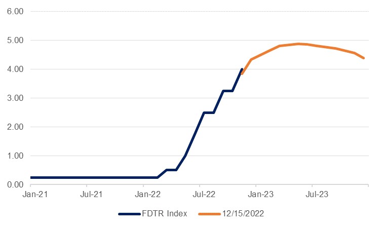 The market remains more dovish on the rate outlook, with traders pricing in a peak Fed Funds rate of 5.0% in H1 2023 followed by two rate cuts in H2 taking the benchmark back to 4.5% by the end of next year.