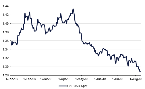 GBP remains in the spotlight with Brexit uncertainties and the prospect of a “no deal” outcome resulting in GBPUSD being pushed below 1.29 for the first time in 2018. UK Q2 GDP tomorrow is expected to show that growth improved from 0.2% q/q in Q1 to 0.4% in the last quarter, but, any downside surprises are likely sour sentiment towards the pound further. Meanwhile the NZD has fallen to its lowest in more than two years after the Reserve Bank of New Zealand left interest rates unchanged at 1.75% but pushed back its forecast for an interest-rate increase to late 2020 and lowered its estimate for economic growth over the coming year.