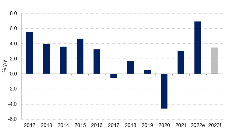 The GCC countries have enjoyed a strong performance in 2022 on several fronts. We expect economic growth in the region to come in at around 7% on a nominal GDP-weighted basis, the fastest in over a decade. This has largely been driven by double-digit growth in oil production across the region as the pandemic-related production cuts were fully unwound.