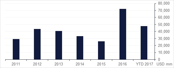After record new GCC bond issuance in the first half of 2017, primary market seems to have grinded to a halt in the third quarter. In H1 2017, governments of the six GCC nations issued an unprecedented amount of bonds to cover budget deficits caused by low oil prices. Large deals such as the $9 billion sukuk from Saudi Arabia, $8 billion bond from Kuwait and $5 billion debt raising by the Oman government lead the total issuance to reach a record $43 billion in the first half this year compared with $36 billion in the year before.