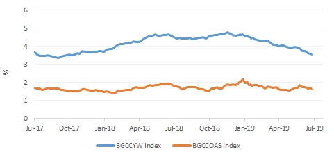 - Increasing prospects of oil production cuts boosted the case for higher oil prices which in turn stimulated the bid for GCC bonds. In addition, incremental bid on the back of index inclusion also continued to support GCC bonds. However, the biggest push for the June rally in GCC bonds came from the big slides in US treasury yields on the back of weak economic data and continuing trade tensions. Average option adjusted credit spreads on Bloomberg Barclays GCC bond index narrowed 25bps to 170 bps in June, facilitating monthly total returns to exceed 2.67%.