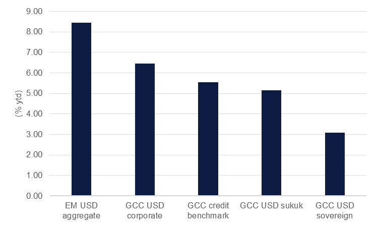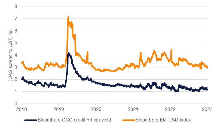 For 2024, macro conditions for GCC credit look more favourable. We expect the Federal Reserve to begin cutting interest rates mid-way through 2024, helping to lift bonds in general. If the Fed is successful in engineering a soft-landing—milder growth, a modest increase in unemployment and slowing inflation—then demand for risk assets like EM credit should be healthy. For the GCC, pegged currencies to the US dollar means that sovereign credit should track performance in benchmark treasuries and help to eliminate some of the FX volatility related risks that could impact EM peers.