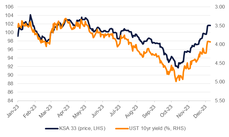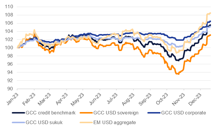 GCC credit is riding out a decent end to 2023 in line with a broader move higher in emerging market bonds. The Bloomberg GCC benchmark index, including investment grade and high-yield bonds, is up 5.53% year-to-date as of December 20th. The performance was largely down to corporates, up by about 6.5% ytd, while GCC sovereigns lagged somewhat, gaining a bit more than 3% on the year. Overall regional credit followed rather than led wider emerging market bonds with Bloomberg’s EM USD index adding about 8.5% since the start of the year.