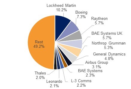 The impact of transferring knowledge and technology from defence expenditure is importnat in terms of industrial compensation arrangements, often referred to as offset programs. The scope of these programs is to provide the conditions that large item purchases from foreign suppliers can create additional benefits to the economy, including the creation of domestic job opportunities. As UAE was the second largest military spender in the MENA region after Saudi Arabia , accounting for 13.4% of total spending in 2016, we expect offset programs to continue having significant impact to the economy. Overall, total arms sales recorded USD 402bn in 2016 with 7 US companies being among the top 10 suppliers with a combined arms sales value of USD 152bn for the same period, as the graph below shows.