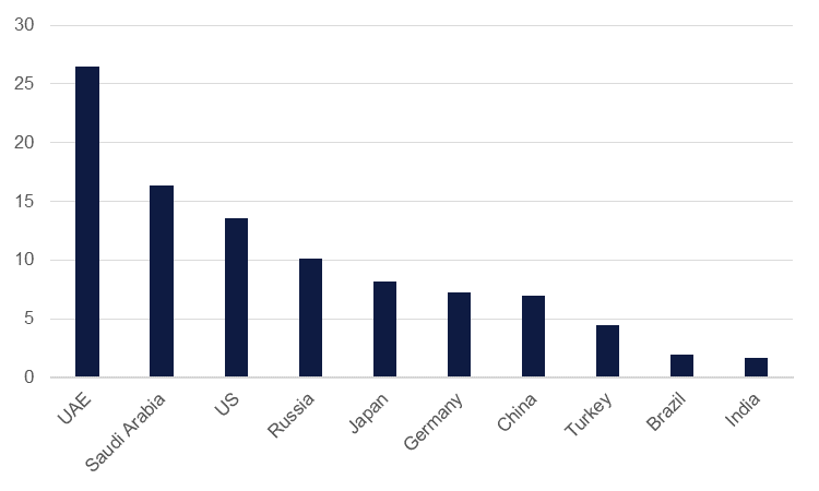 The announcements from the GCC economies ahead of COP 26 will likely be welcomed but collectively Saudi Arabia, the UAE and Bahrain account for less than 3% of total global CO2 emissions. More aggressive targeting of CO2 reduction will need to come from developed markets and large emerging economies to achieve the Paris Agreement's preferred goal of keeping temperature increases to 1.5 degrees Celsius above pre-industrial levels. According to the International Energy Agency’s recent assessment, the world is falling short of hitting the higher 2 degrees Celsius target outlined in the Paris Agreement under both its stated policies and announced pledges scenarios and will fall well short of hitting the 1.5 degrees goal.