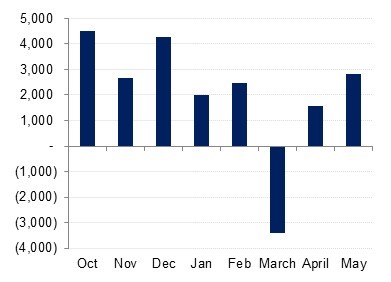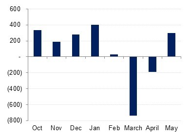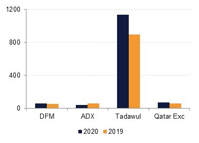 Trading volumes continued to improve across markets. In May 2020, the average daily valued traded jumped 7% m/m on the DFM and 9% m/m on the Tadawul. The trend was similar on a y/y basis with an increase of 27% on the Tadawul in the first five months of 2020 compared to 2019.