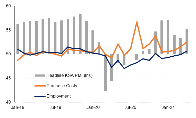 Saudi Arabia’s headline PMI rose to 55.2 in April from 53.3 in March, the highest reading since January. Both business activity and new orders grew at the fastest rate in three months and employment in the private sector increased (slightly) for the first time in five months.