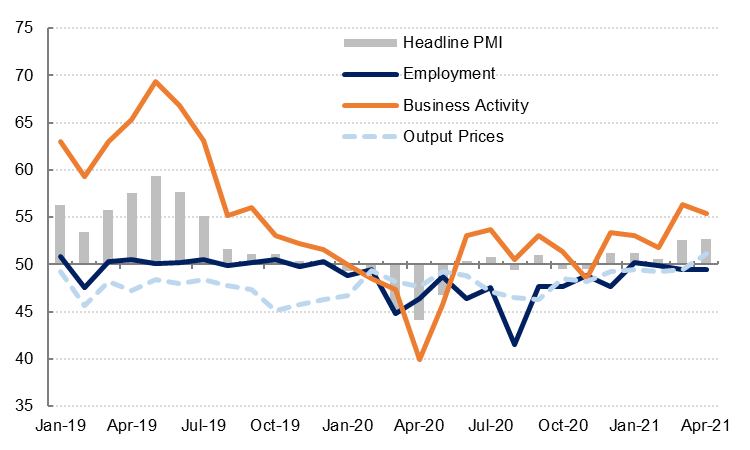 Despite improving output and new orders, employment in the private sector declined for the third month in a row, albeit only slightly, as firms remain focused on containing costs. Input costs rose for the third consecutive month, reflecting higher raw materials prices and shipping charges, but the rate of increase was slower than in March. Suppliers’ delivery times lenghthened again, reflecting shortages and supply chain issues for some items. As a result of higher input costs, firms raised selling prices for the first time since September 2018, although the increase was modest.