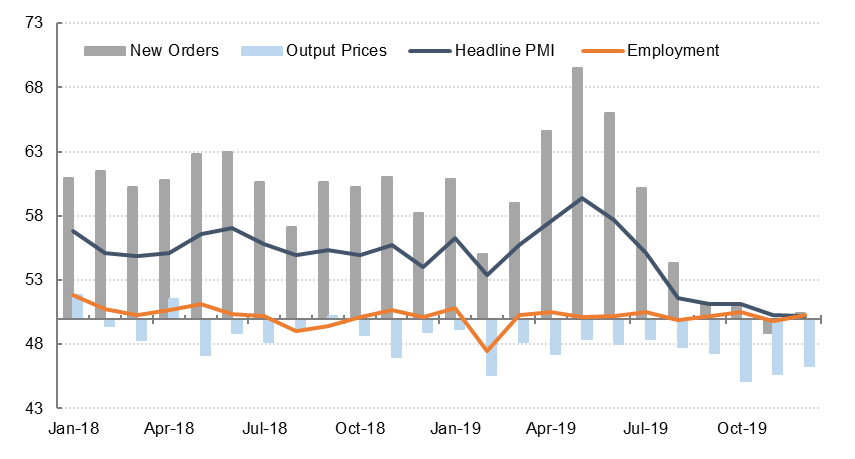 Saudi Arabia’s PMI declined to 56.9 in December from 58.3 in November, the lowest reading in five months. A marginal decline in new export orders contributed to slower growth in overall new orders, although the data suggests it is domestic demand that is driving output and new work in the kingdom. The employment index declined to 50.5 in December, indicating very little private sector job growth. Price pressures remain muted, with almost no change in overall input costs last month.