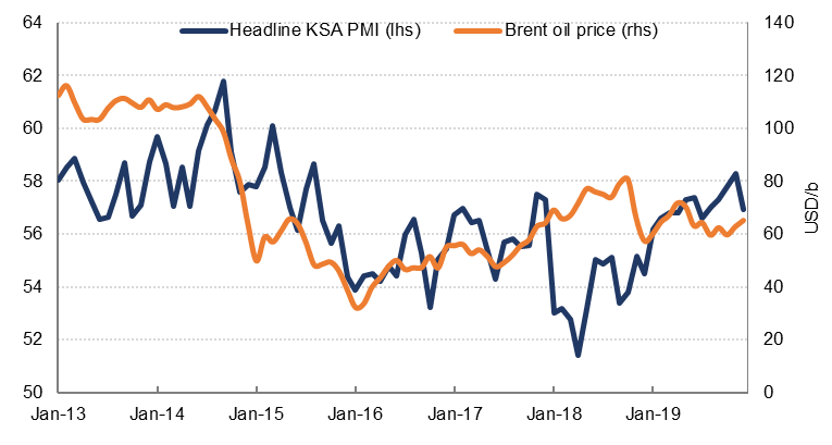 The average PMI reading for Saudi Arabia last year was 57.1, the highest reading since 2015. This is consistent with official GDP data which shows the non-oil sector expanding at the fastest rate in five years in Q3 2019. Expansionary fiscal policy which has been in place since 2017 has in our view been the main driver of accelerating growth over the last year, although structural reforms have likely been a key contributor as well.