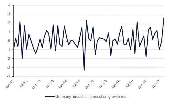 German industrial production surged in August, posting its biggest monthly rise in six years. Data from the Economy Ministry showed the combined production of manufacturing, construction and energy increased by 2.6 percent in August after edging down by 0.1 percent in July. The figures easily beat market expectations of a 0.7% rise. Although the makeup of the new government could add uncertainty, the strong industrial figures suggested the German economy is firing on all cylinders and is on solid footing for robust growth in the third quarter.
