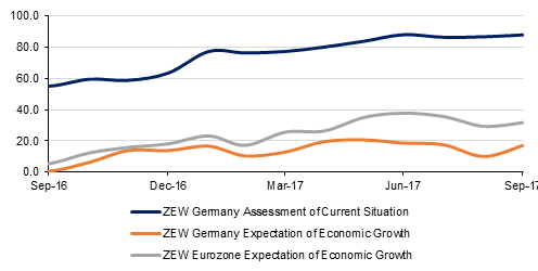 German investor sentiment improved more than expected in September, the ZEW research institute showed its economic sentiment index rose to 17.0 September from 10.0 in August. This was far stronger than the market consensus of 12.5. A separate measure of investor’s perception of current condition’s edged up to 87.9 from 86.7, this was the highest level in 88 months. The data underscore other business survey such as the Ifo which point to a continued acceleration in growth in the Eurozone’s largest economy.