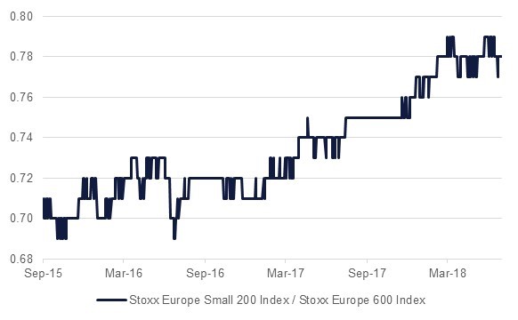 As the trade war becomes a reality, there is consensus view that European equities appear more vulnerable as they derive a significant percentage of revenues from exports. However, it is interesting to note that small cap stocks in Europe have outperformed the large cap stocks. One plausible reason for this is the limited impact of trade tariffs on small-cap companies.