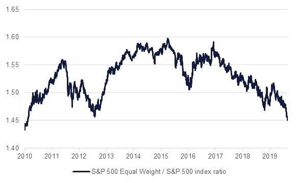 While the S&P 500 index is still positive for the year, the gains amid index constituents is more uneven. The S&P 500 equal weight index which counts each stock equally, according to Bloomberg, fell to a multi-year low relative to the broader index. Over the last 1 year, the equal weighted index has lost -1.7% compared to gain of +0.9% in the S&P 500 index.
