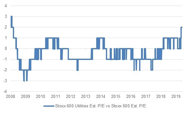 The sharp drop in bond yields has seen investors add positions in defensive stocks. European utilities sector stocks have rallied +16.0% ytd. However, that has resulted in the Stoxx 600 utilities index at its most expensive level since 2008 relative to the broader regional index on an estimated earnings basis.