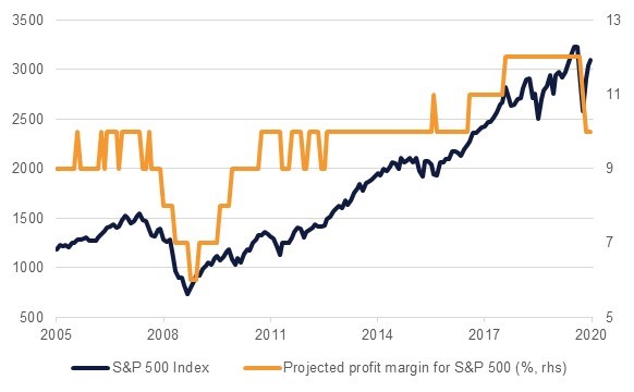 With equity markets close to erasing their year to date losses, the disconnect between price performance and corporate earnings is becoming stark. US corporate earnings dropped 16% in Q1 2020 and are expected to fall further in Q2 2020. Similarly, consensus forecasts show that the net income margin is expected to drop by 2.2% in 2020 to 9.5%. The net income margin peaked in January 2019 at 12.3%. Price performance generally has a positive correlation to earnings and margins.