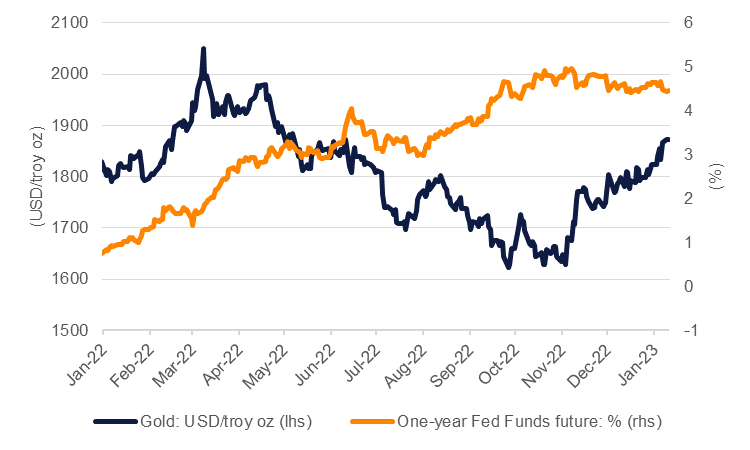 The relentless rise in rate expectations and UST yields, along with a stronger dollar, helped to sink gold prices over much of H2 2022 but now the outlook for rates is more uncertain. Fed officials still expect to see the Fed Funds rate at more than 5%—Raphael Bostic of the Atlanta Fed and Mary Daly from San Francisco were the latest speakers to support holding rates above that level—but markets aren’t buying that the Fed will need to be as hawkish. The latest nonfarm payrolls report for December showed another strong headline gain in jobs numbers but accompanied by a slowdown in average hourly earnings. In addition, near-term indicators of US economic activity have turned decidedly negative: the services ISM for December fell sharply to 49.6 from 56.5 a month earlier. The evident slowdown in the economy—perhaps even qualifying for the Fed’s mythical soft landing—has meant that markets are anticipating that rates will peak at 5% mid-year and then start to move lower by the end of 2022.