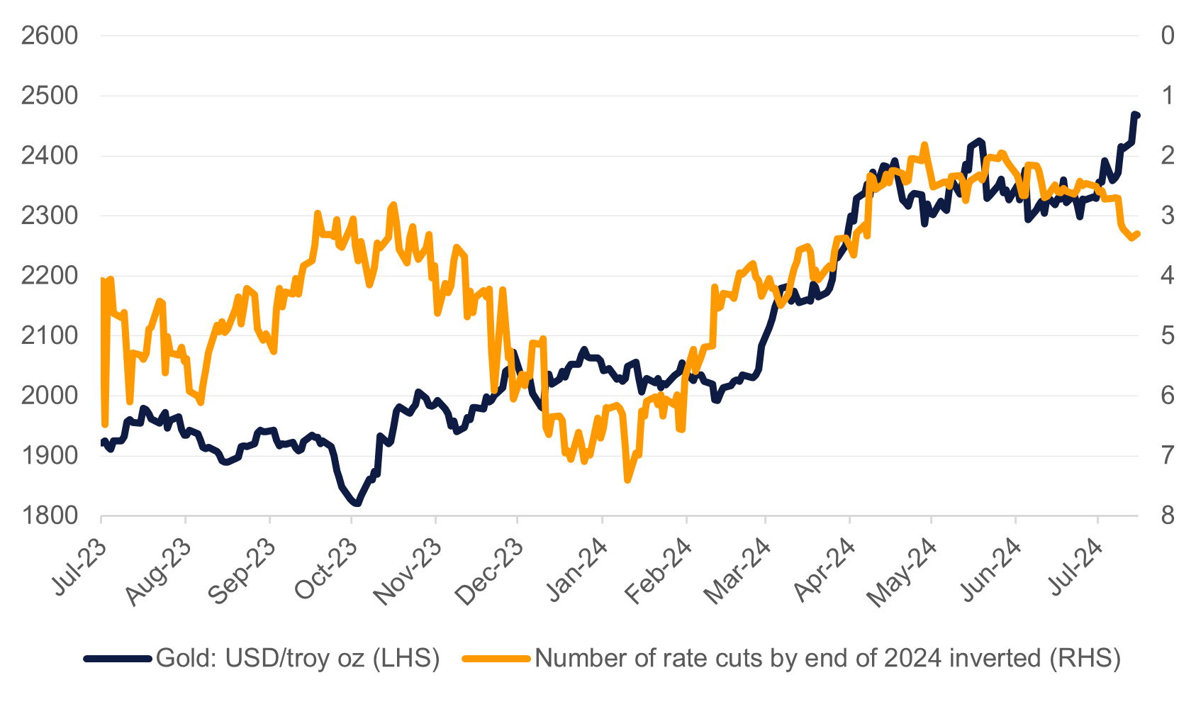 The current rally in gold seems to be built on expectations that the Federal Reserve will start to cut rates meaningfully before the end of 2024. At the start of July Fed funds futures priced in fewer than two 25bps cuts by the end of 2024, while by July 17th that pricing had increased to almost two and half cuts fully priced before year-end. The intuitive relationship between gold and rates is that as rates move lower and yields decline on US Treasuries and other fixed income instruments, gold becomes more attractive. However, while the gain in gold prices in July may have been catalyzed by rate expectations, in the medium- and longer-term their influence on gold prices holds less significance.