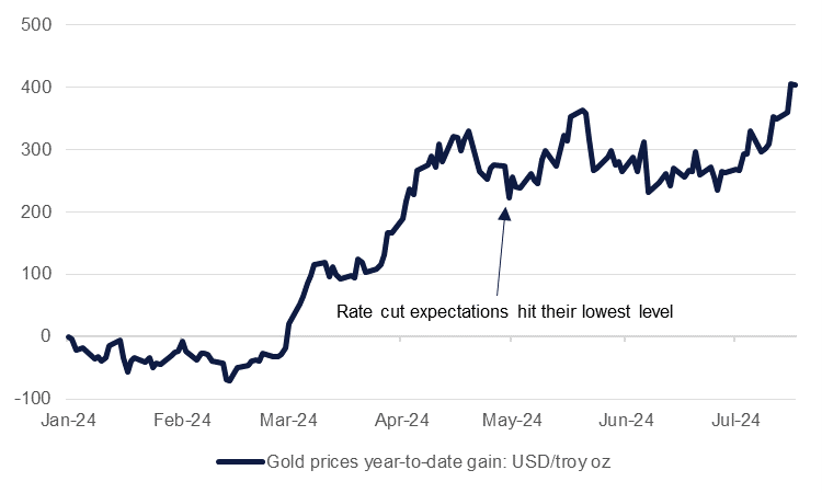In July, as rate cut expectations have increased gold prices have rallied by USD 140/troy oz or about 6%. But most of the year’s gains in gold came during Q1 and the early parts of Q2 as rate cut expectations were actually declining. Inflation estimates in Q1 for the US economy were higher than expected and investors adjusted their rate cut expectations lower. During that period gold prices rose by nearly USD 330/troy oz or roughly 16%.