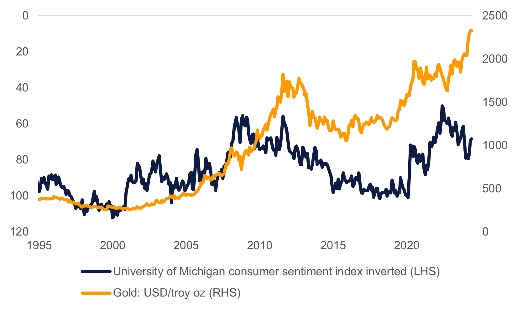 The relationship between consumer sentiment and the performance of equity markets may be circular. Equities tend to perform well during US election years even if policy plans of respective candidates are not themselves perceived as pro-markets. But an improving sentiment and equity market gains (the S&P 500 is up almost 19% so far this year) should be headwinds to gold prices pushing higher and higher.