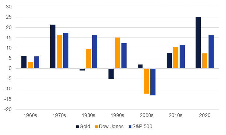 Over the medium- and longer-term the influence of factors like consumer sentiment, the performance of equity markets and the US dollar exert an apparently more powerful effect on gold prices. As gold is the near ultimate sentiment investment (it pays no dividend or yield and has limited commercial application) it appears to benefit from periods of deteriorating consumer and investor optimism. Gold has trended higher when the University of Michigan’s consumer sentiment survey has deteriorated: the global financial crisis and pandemic appear to highlight this relationship.