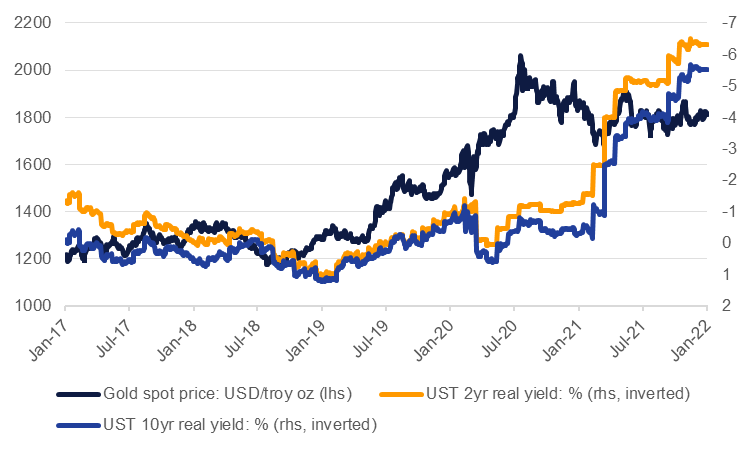Even if gold is not reacting to the diminished risk from Omicron, another salient threat to gold prices comes from the hawkish shift from global central banks, most notably the Federal Reserve in the US. As it looks clear that the Fed will engage on a brisk pace of policy normalization—we expect four rate hikes this year, beginning at the March FOMC—treasury yields have soared. The 10yr UST yield has added almost 40bps since the start of the year to just shy of 1.9% and yield gains have been spread across the curve. Inflation adjusted yields have also driven higher with 10yr real yields up to -0.59% as of mid-January compared with less than -1% at the end of 2021.