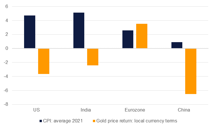 As the economic impact of the Omicron variant of Covid-19 looks to be far less meaningful than initially feared, gold prices look unreasonably stable. Since the discovery of the much more transmissible Omicron variant, gold prices have oscillated from highs of around USD 1,870/troy oz to lows of around USD 1,770/troy oz and have spent much of 2022 so far holding at around USD 1,800/troy oz. With the threat to global growth seeming to diminish—even as major economies like China maintain a zero Covid policy—the allure of a haven asset like gold will fade.