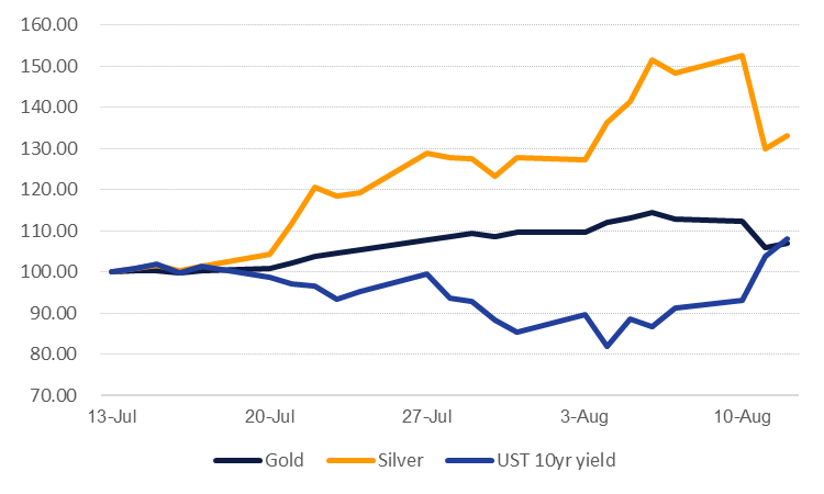 The immediate catalyst for the sell-off in gold appears to be the uptick in UST yields. Yields on 10yr UST have gained over 10bps since the start of the week, trading at around 0.67% at present. Inflation adjusted yields have also moved higher, gaining around 10bps from their recent trough level of -1.08% to test -0.99% currently. The uptick in US producer price inflation for July, up 0.6% m/m, also should help to alleviate some near-term deflationary fears.