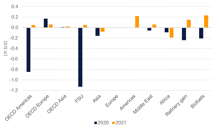 On the supply side of the market, the IEA expects non-OPEC supply growth of close to 600k b/d with Canada, Brazil and Norway making up much of the gains. The agency estimates that total non-OPEC supply (including some countries that do make up part of OPEC+) fell by 2.6m b/d on average in 2020. Projections for US output still point to an annual decline as producers there focus on profitability at the expense of growth, even as prices have recently started to move close to breakeven capex costs for some fields.