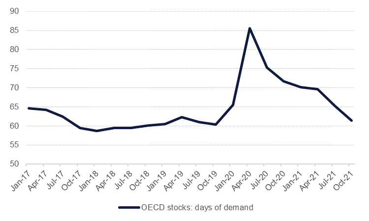 Based on the IEA’s revisions to its demand projections we expect to see inventories draw down in 2021 by an average of 1.3m b/d compared with a near 3m b/d increase in 2020. The biggest question mark to us remains Q2 when OPEC+ countries notionally should add volume back to the market. Even with those barrels coming back in, our projected surplus of 530k b/d is negligible compared with the 6.2m b/d surplus recorded in Q2 2020! But inventories in isolation can’t tell us if a market is truly tight or loose and hence we prefer to look at them through the lens of demand. After peaking at over 85 days’ worth of demand in Q3 2020, OECD stocks should normalize to around 60 days by the end of this year.