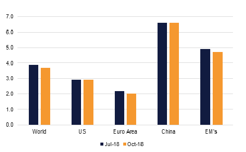 The IMF has lowered its forecast for global growth for this year and 2019. It now expects global economy to grow at 3.7% this year and in 2019, down from 3.9% projected three months ago. It was the first downgrade since July 2016. The fund attributed the downgrade to rising trade confrontation and a sharper-than-expected rise in interest rates. The IMF’s cut to its outlook was broad-based. It downgraded the forecast for US and China’s growth in 2019 to 2.5% and 6.2% respectively while the Eurozone’s projection was lowered by 0.2% to 2% for 2018.