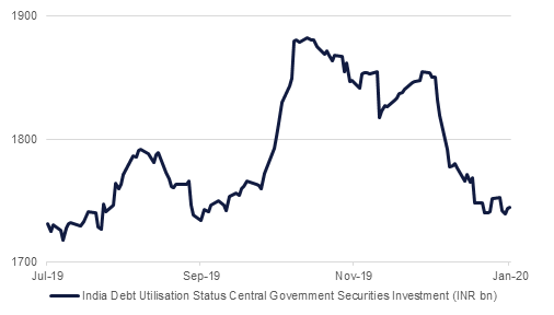 In the first month of 2020, yields on 10y government bonds rose +5bps to 6.60% as worries over the government’s financing program amid weak growth dynamics outweighed moves in global benchmarks. In contrast, the YTW on Bloomberg Barclays EM Local Currency Government index dropped 16 bps to 3.56% and on 10y US Treasuries dropped -32bps to 1.50%. The move in global benchmarks was primarily on account of concerns from the outbreak of coronavirus. With the government signaling fiscal consolidation and keeping borrowing plans benign, we expect pressure on yields to ease.