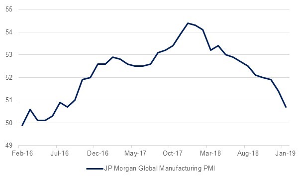 The PMI data from China was in direct contrast to the robust picture painted by the US jobs data. The Caixin/Markit manufacturing PMI reading for January came in at 48.3, the lowest reading since February 2016 while the services PMI was more robust with a reading of 53.6. The overall Caixin/Markit composite index remained in expansion territory despite dropping sharply from 52.2 in December to 50.9 in January. However, worryingly the trend in China’s PMI readings was similar to that seen across economies. The JP Morgan Global Manufacturing PMI slowed to 50.7 in January 2019 from 51.4 in December 2018.