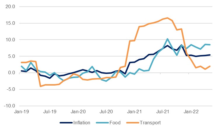 Headline CPI inflation has averaged 5.3% over the first five months of 2022, as global price pressures emanating from reopening frictions and the war in Ukraine have been brought to bear. This has kept inflation at similar levels to those seen over the same period last year, even as the 20% devaluation of the dinar in December 2020 has passed through the base. While petrol subsidies have kept the rise in transport costs low by global measures – just 2.0% y/y in May – the 8.5% rise in food prices will weigh heavily on households, especially with unemployment still high. With government formation having suffered another setback in recent weeks, the resolution of any of these issues in the near term appears unlikely, running the risk of social unrest which would further hold back the recovery.