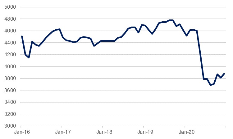 There are few economies more exposed to fluctuations in the oil markets than Iraq, where the commodity accounts for over 95% of exports, over 90% of government revenues, and some two thirds of GDP. Coupled with the security challenges of recent decades and the resultant infrastructure deficit – in particular there remain significant reconstruction needs following the ISIS civil war – Iraq was especially poorly placed to cope with the fallout of 2020. Oil exports in the second quarter fell 60% y/y as a collapse in global demand weighed on prices, and while prices ticked up modestly in the third quarter, production curbs will have offset any gains from this. Iraq missed its OPEC+ targets earlier in the year, but a pledge to make up for this subsequently saw average production drop to an average 3.7m b/d in Q3, compared to 4.2m b/d in Q2.