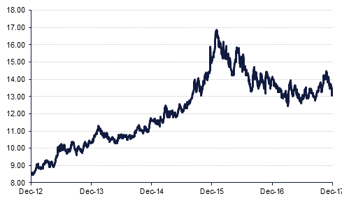 Japanese trade data was released today, with exports climbing by 16.2% y/y in November, outstripping October’s growth of 14.0%, and analyst expectations of 14.7%. The growth was driven by demand for electronics in neighbouring Asian countries. Japanese exports to China have seen particularly strong growth, expanding by 25.1% y/y. Imports expanded by 17.2%, slower than October’s 18.9%, and slower than consensus estimates of 18.0%. This contributed to a significant narrowing of Japan’s trade balance, from JPY285.4bn in October to JPY113.4bn in November. The data comes in the days leading up to the Bank of Japan’s monetary policy meeting scheduled to begin on Wednesday. Despite the run of positive trade data and years of very easy monetary policy, Japanese inflation remains stubbornly low, making any chance of a change to current policy slim.