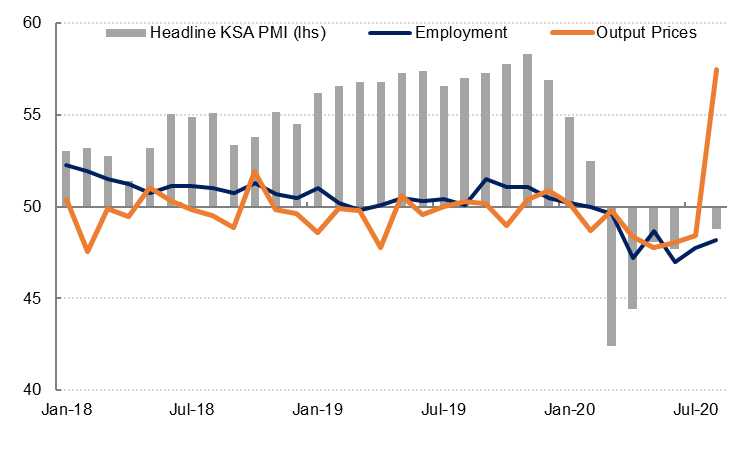 Saudi Arabia’s headline PMI declined to 48.8 in August from 50.0 in July. Output and new work declined at a faster rate than in July, with higher prices likely weighing on domestic demand. Both input costs and selling prices rose sharply in August, reflecting the impact of the hike in VAT to 15% which came into effect in July. However, weak external demand has also weighed on Saudi Arabia’s recovery as new export orders declined for the sixth month in a row in August.
