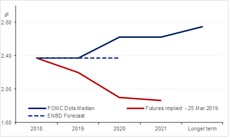 As expected, the FOMC left rates unchanged at its meeting last week and revised its growth forecasts down for this year and next. The ‘dot plot’, shows the median expectation is now for no rate increases in 2019, compared with expectations for two hikes as of last December. This revised path reflects the ‘patient’ stance adopted at the January FOMC and reiterate the Fed’s data-dependent reactive rather than proactive stance.