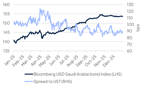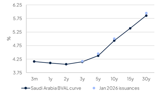 Saudi Arabia confirmed its 2026 borrowing plans earlier this week, expecting between USD 14-18bn to come via international bond markets. If confirmed, the January issuance would represent about 70% of the total international bond issuances expected in 2026. In 2025, the sovereign followed up its January issuance with two additional bonds (including a EUR 1.5bn green bond) and two USD sukuk.