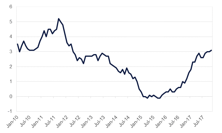UK inflation accelerated modestly to 3.1% in November, from 3.0% in October and September, marking the highest rate since March 2012. The acceleration in inflation was driven by higher air fares and more expensive computer games. As the print was more than one percentage point off the target rate of 2%, the Bank of England governor, Mark Carney, is now obliged to write to the Chancellor of the Exchequer laying out how he intends to bring inflation back into line, but having raised rates by 25 basis points in November, we do not expect another hike in the near term.