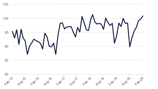 Economic data collected before the outbreak of the Covid-19 virus showed that major economies were already beginning 2020 on a soft footing. Industrial production and core retail sales in the US slipped in January. Industrial output fell 0.3% m/m, negatively impacted by warm weather and production shut-ins at Boeing. Headline retail sales rose by 0.3% m/m but underlying core retail sales—stripping out cars and building materials—were unchanged. However, the flat retail sales may be just a blip given the persistent health of the US labour market and consumer confidence which continues to remain high. The University of Michigan’s consumer confidence measure moved to 100.9 for February, a two-year high.