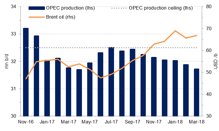 - Oil prices have rallied to their highest level since the end of 2014 as OPEC continues to display strong compliance with its production cut. Risk factors in the oil market point to potentially more upside ahead thanks to unplanned outages in Venezuela, the risk of sanctions on major producers and the US disappointing bullish growth expectations.
