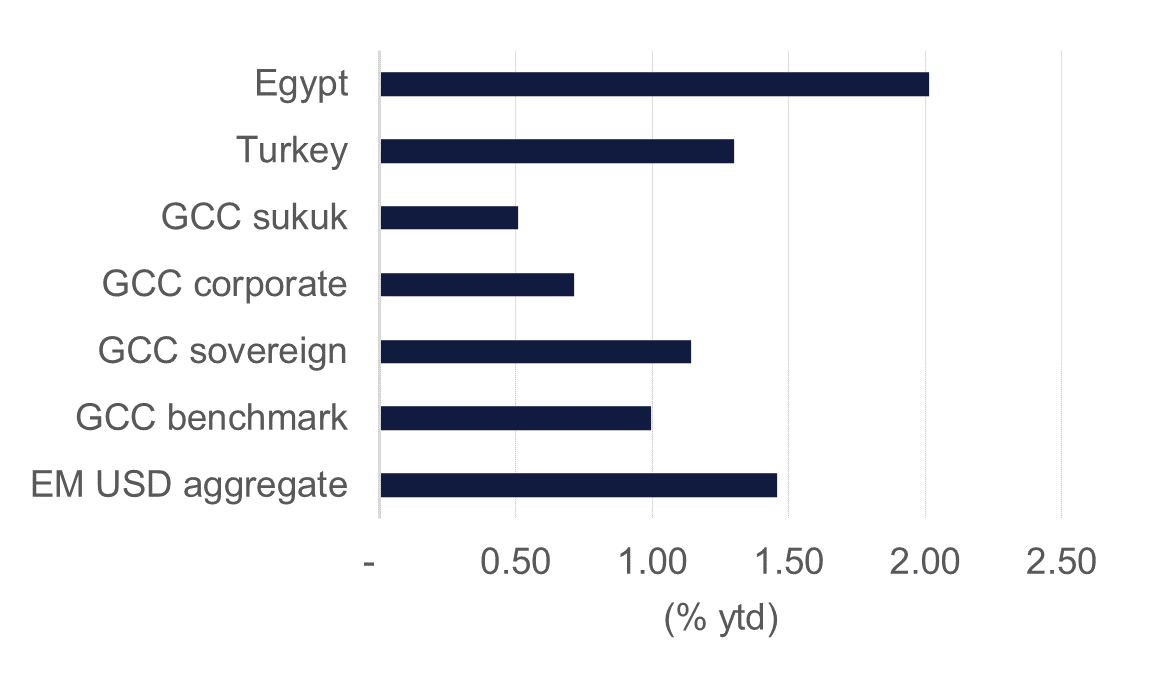 GCC bonds tracked the gain in the wider emerging market space with a 0.3% rise in GCC USD debt. At a sector breakdown, sovereigns were the strongest performer with a rise of 0.4% last week while sukuk lagged with a 0.2% gain. On a geographic basis the Qatar index was the strongest performer week/week with a gain of 0.4% while Saudi Arabia and the UAE had gains at slightly smaller levels.