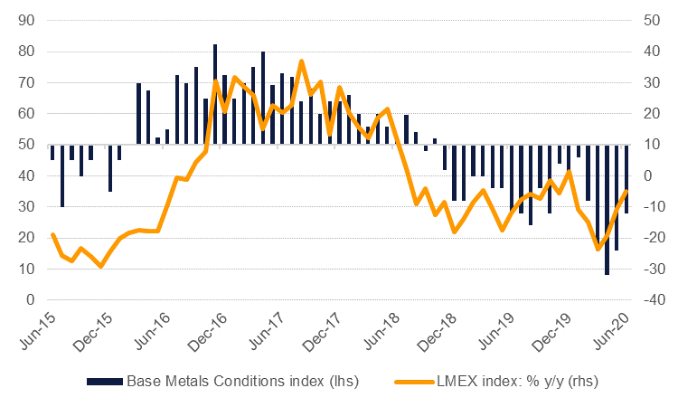We estimate that conditions for base metals hit an absolute bottom in April this year as global PMIs sank, industrial activity collapsed and inventories near across the board of the six major non-ferrous metals increased. Since then conditions have been trending higher but still correlate with the LMEX index declining year/year.