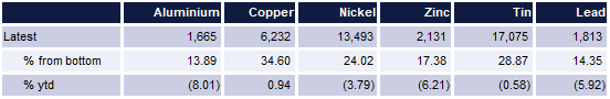 The standout performer has been copper. LME 3mth copper forwards have pushed back above USD 6,000/tonne in recent weeks, gaining almost 35% from the bottom of USD 4,630/tonne, and have managed to post a very modest gain year-to-date. Across the rest of the LME complex prices have all recovered from the troughs but none have yet to record year-to-date gains.
