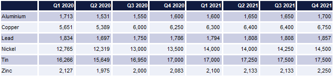 Copper inventories are the one missing piece for a strongly bullish signal as there a conspicuous draw has been absent—hardly surprising given the lockdowns that curtailed industrial demand for much of Q2 2020. Nevertheless we believe copper has a strongly supply constrained picture and expect prices to extend their gains over the rest of 2020 and into 2021. We expect prices to record an average of USD 6,125/tonne for H2 2020 before building momentum and averaging around USD 6,500/tonne in 2021.