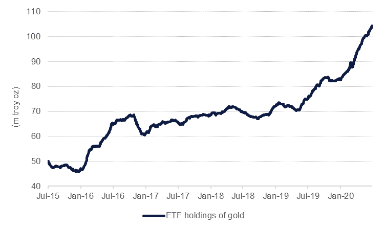 Precious metals prices have shown a split performance in the wake of the coronavirus pandemic. Investors have flocked toward gold as a safe haven bin, particularly as central banks have slashed interest rates and adopted increasingly unorthodox monetary policies. ETF holdings of gold are up 39% y/y as of mid-July and a recent push toward and above USD 1,800/troy oz may prompt the last gold sceptics to throw in the towel and buy into the metal. Gold prices are not far off their peak level of USD 1,900/troy hit in September 2011 and we expect that prices can be sustained around their current levels or higher at least until the end of the year.