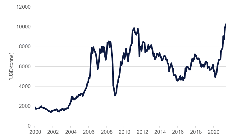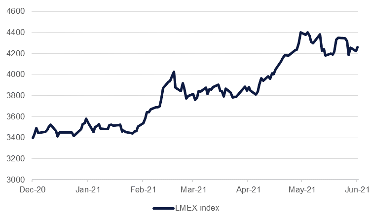 Macro conditions for base metals remain positive. Global manufacturing PMIs remain solidly in expansionary territory with the global PMI hitting 56 in May with manufacturing numbers in China, the US and Eurozone economies still reporting solid growth. There have been some signs of momentum easing—year on year growth in China’s imports of unwrought copper products slowed for a third month running in May while imports of iron ore and concentrate hit its lowest level so far this year in May. But as Covid-19 vaccine programmes continue to expand and help to firm up consumer confidence, we would expect to see a solid demand story play out over the next 18 months, across the metals complex.
