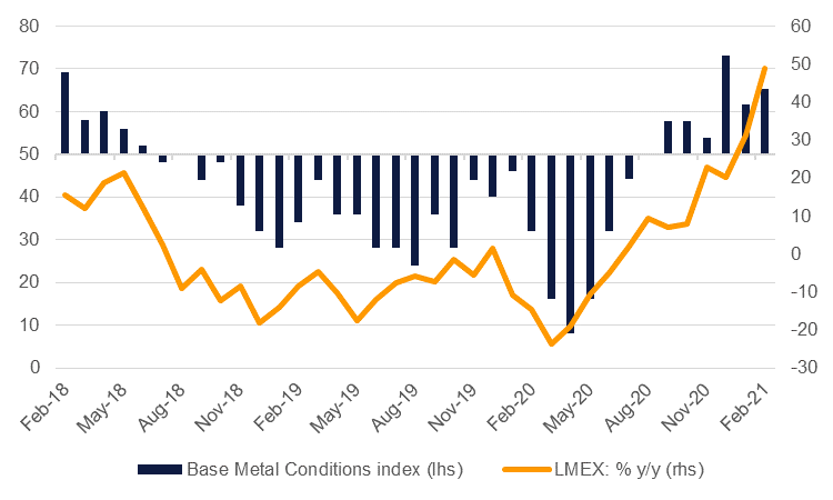 Persistent year-on-year improvements in manufacturing conditions, flattered by the low base effects of H1 2020 when the Covid-19 pandemic took hold of the global economy, are helping to support the turnaround in industrial metals. The global manufacturing PMI at 53.9 for February 2021 is well above pre-pandemic levels and reflects improvements across China and India as well as developed markets such as the US and Germany.